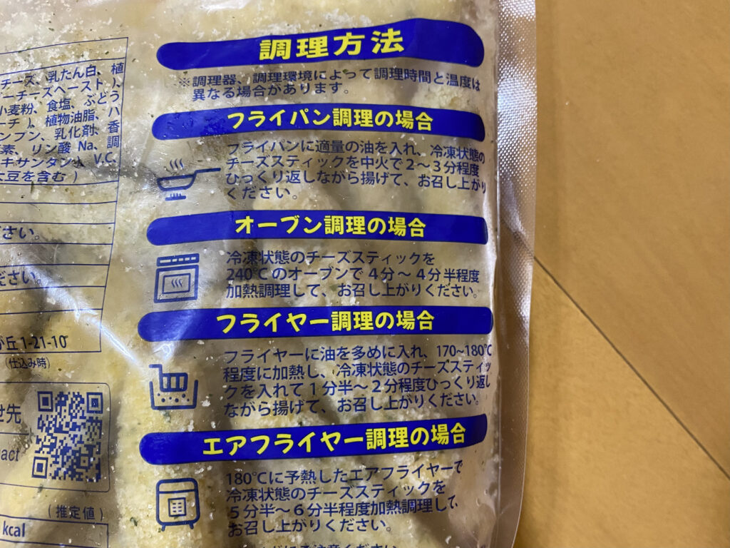 180度に予熱したエアフライヤーを冷凍状態のチーズスティックを5分半~6分半程度加熱調理して、お召し上がりください。